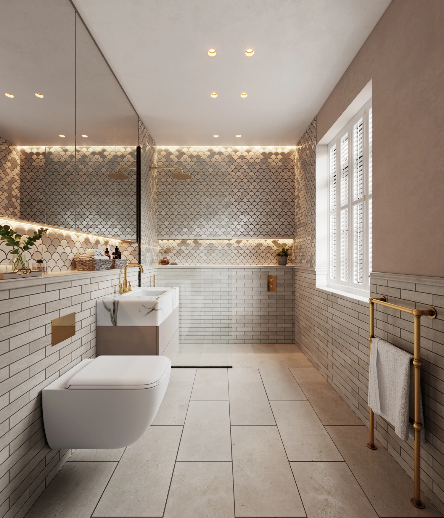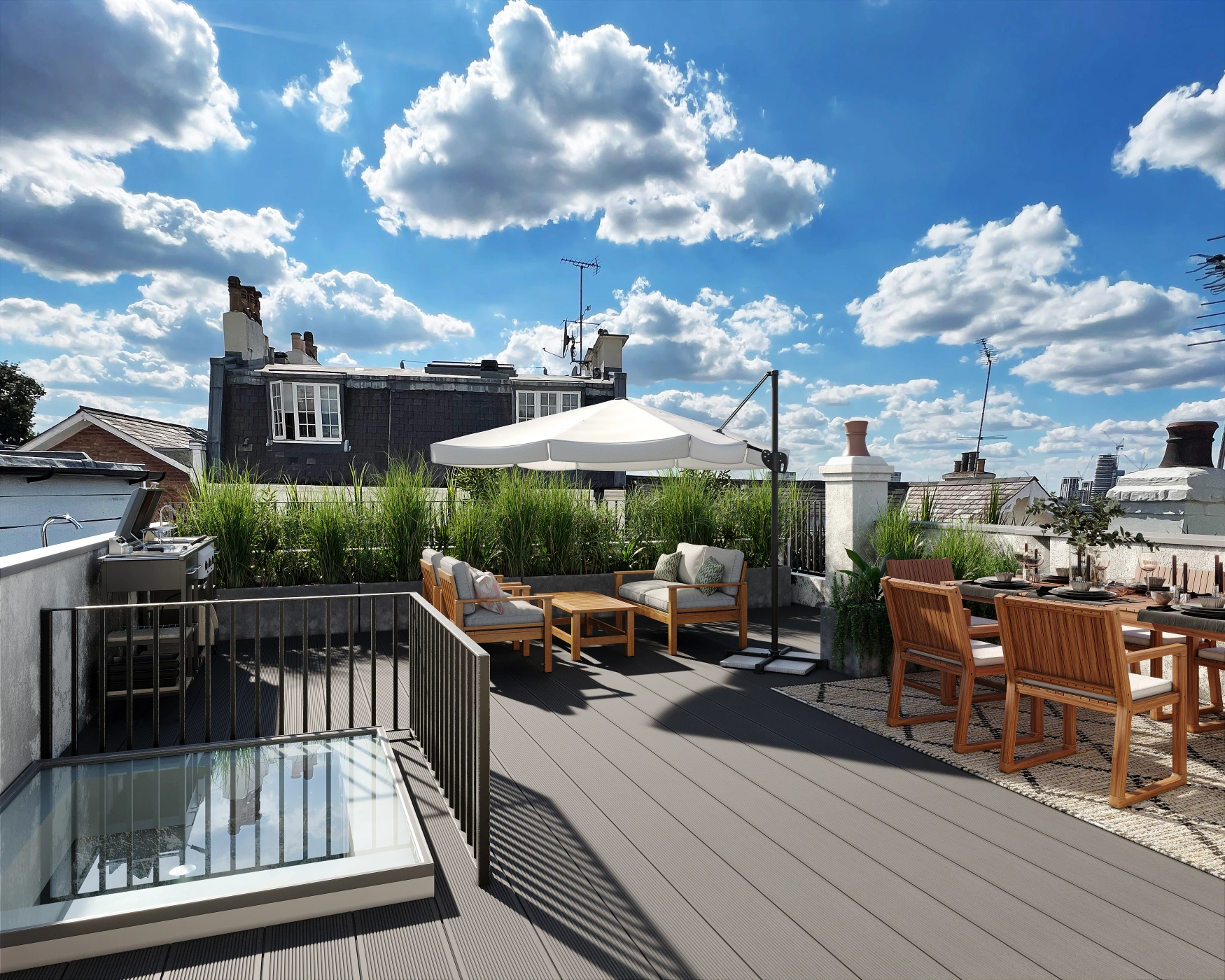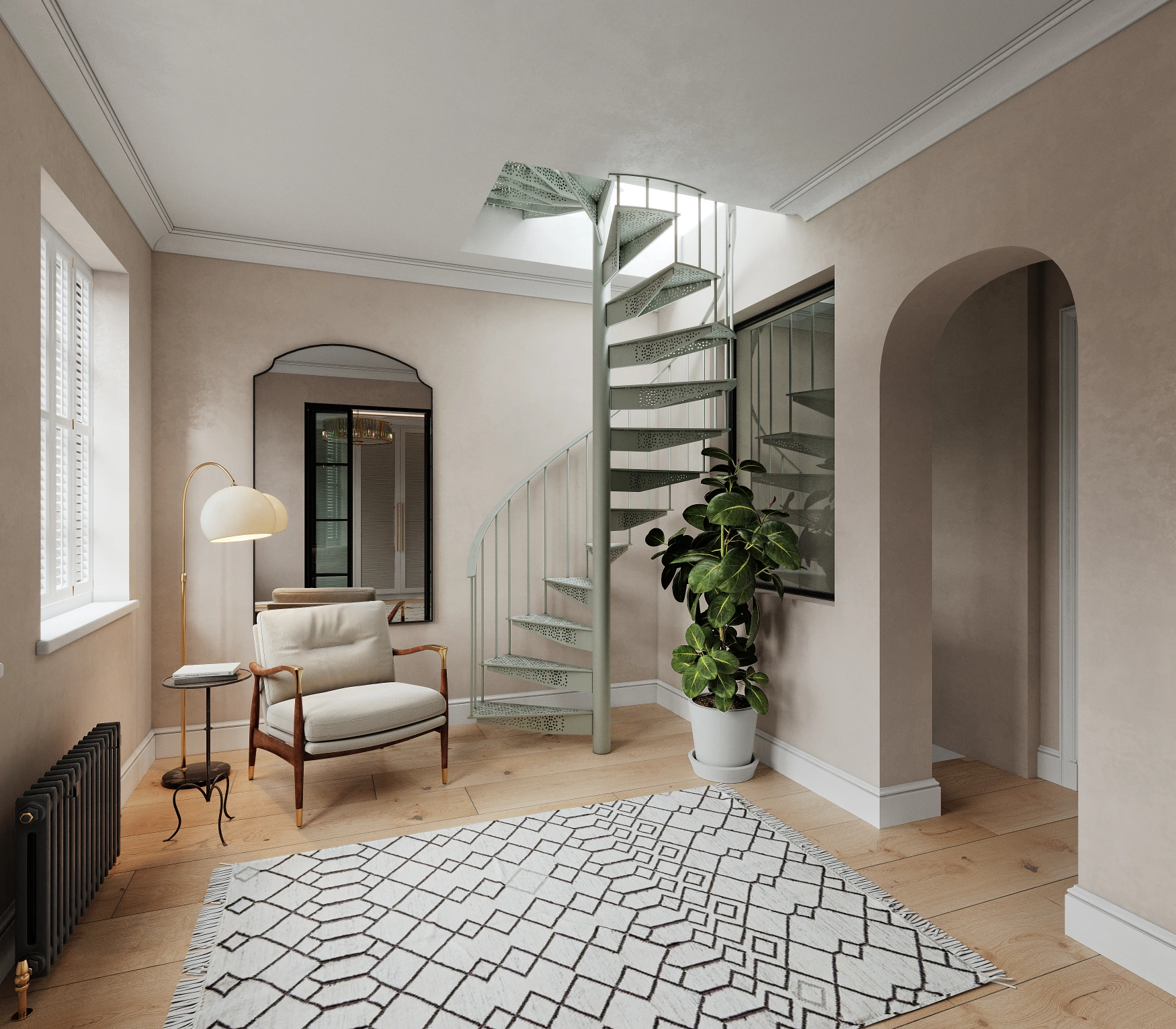 A bespoke motorised rooflight serves as a striking centrepiece, leading to a stunning roof terrace accessed via a custom-designed perforated steel spiral staircase. This feature, which meets stringent regulations while offering a sculptural aesthetic, reflects the botanical influences woven throughout the interior design scheme.