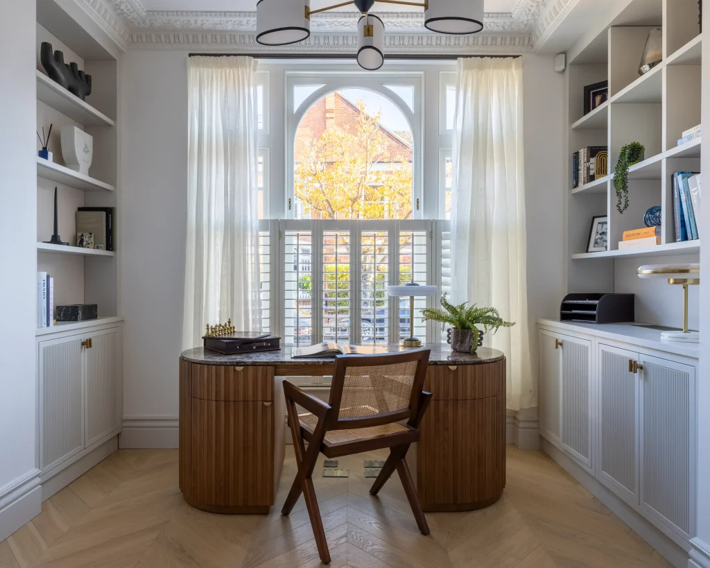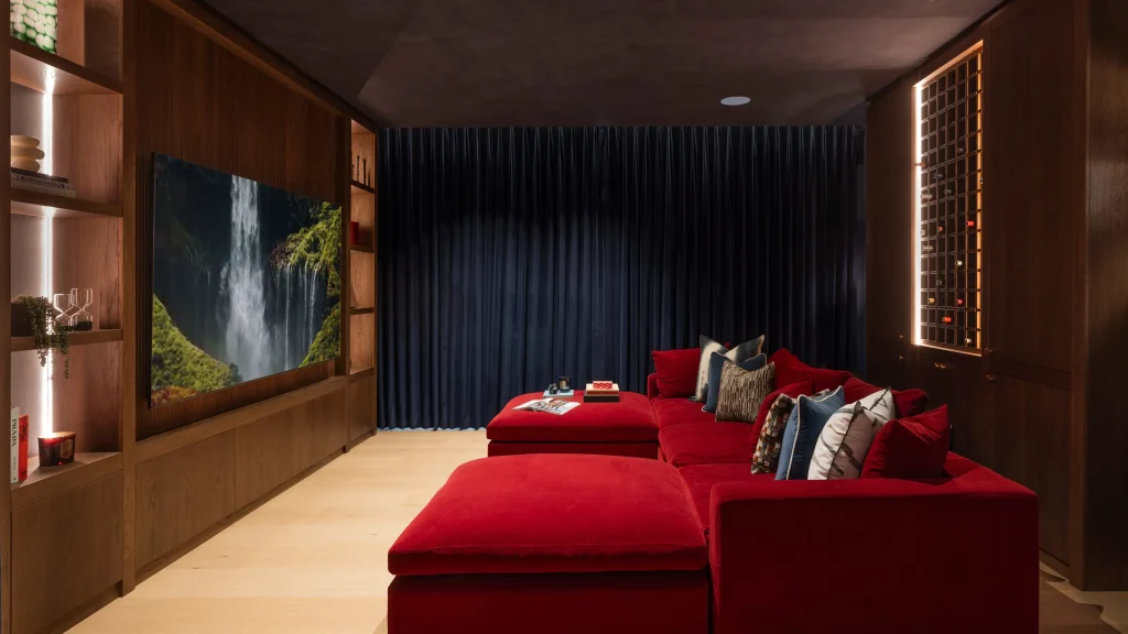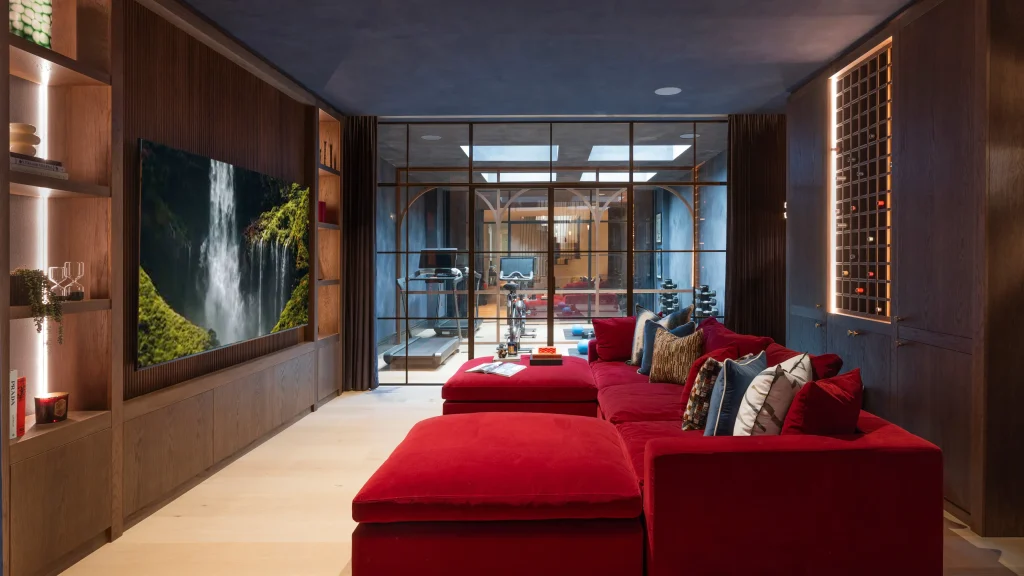 The addition of a striking basement extension enhances the home’s functionality, housing a gym, cinema room, playroom, utility space, and a private guest suite. This new level is seamlessly connected to the main living areas via a bold custom steel staircase.