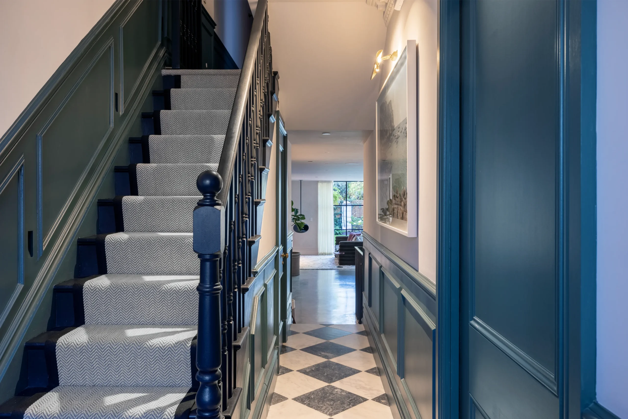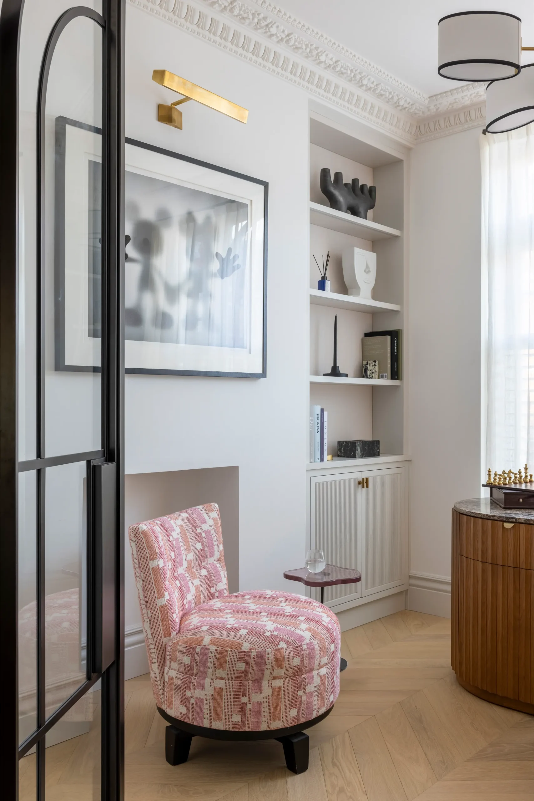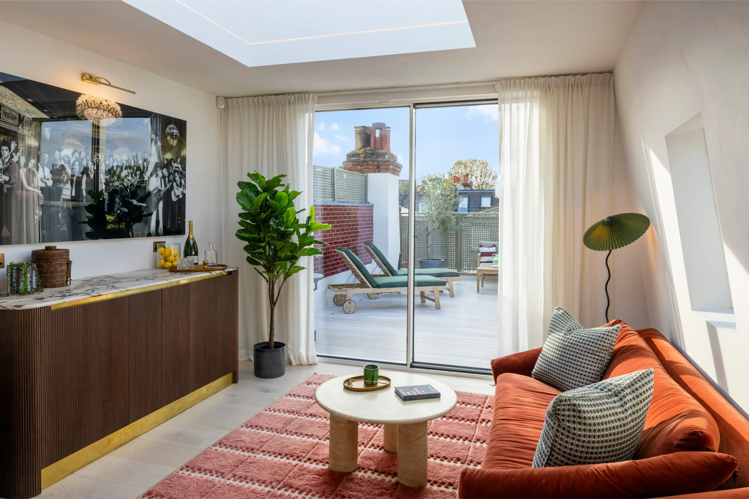 Internal glazing optimises the flow of natural light, creating a bright and airy atmosphere while maintaining distinct zones within the home. The ground floor prioritises family-friendly practicality without compromising on design, while the penthouse suite, complete with a west-facing roof terrace, provides a serene retreat. Bespoke joinery throughout integrates cutting-edge amenities, including discreet air conditioning, Lutron lighting, smart home automation, and a state-of-the-art AV system. The result is a sophisticated, highly functional home that harmonises heritage and innovation, offering exceptional spaces for relaxation and entertainment.
