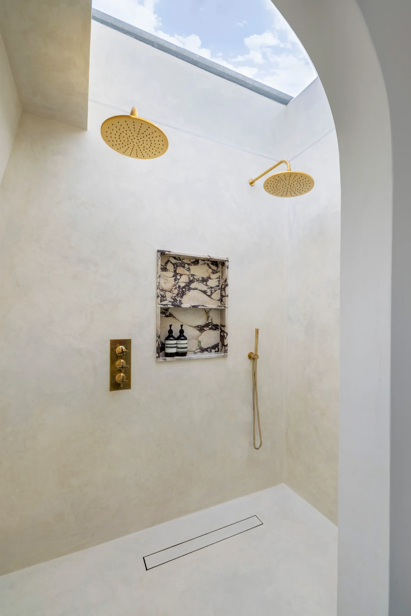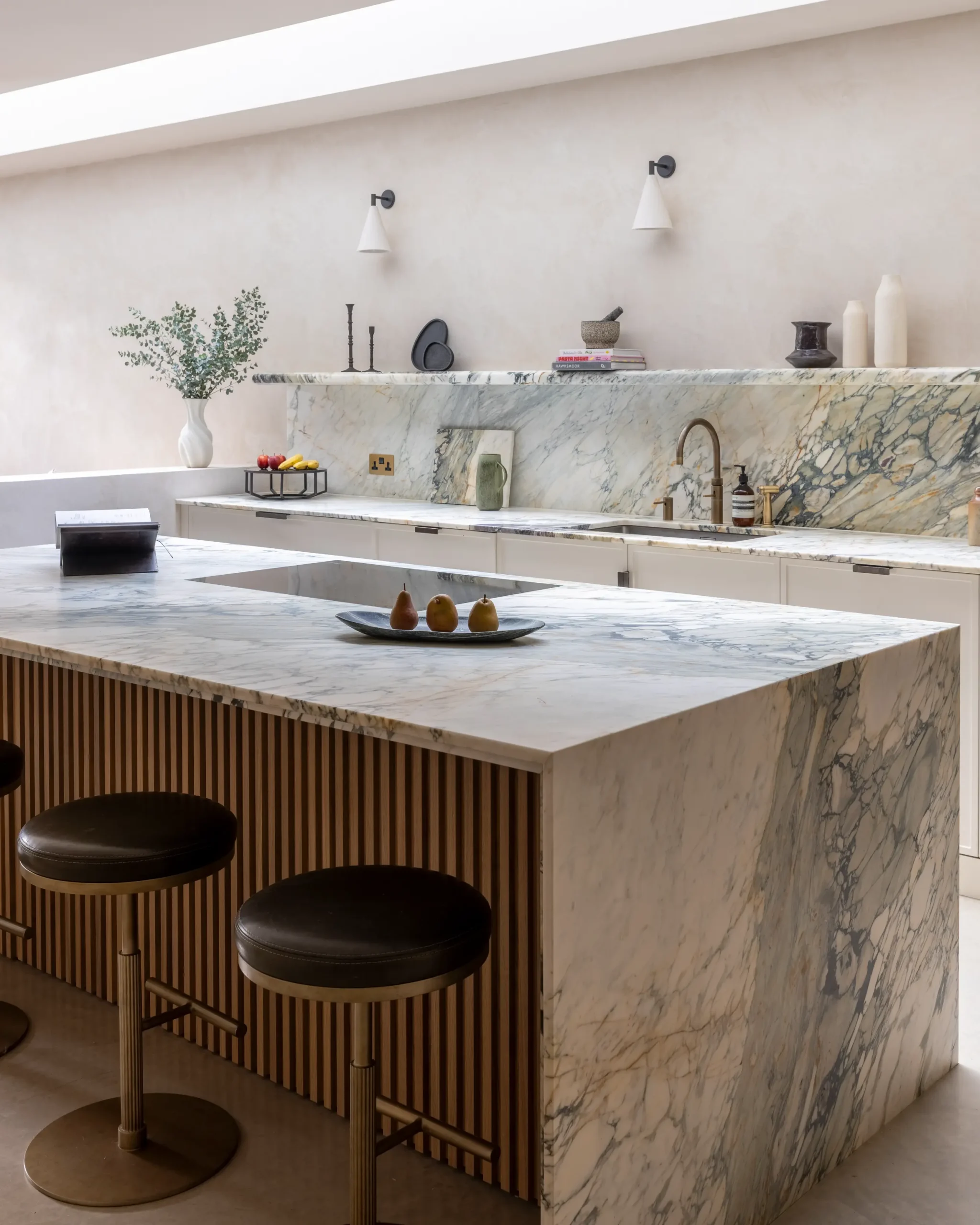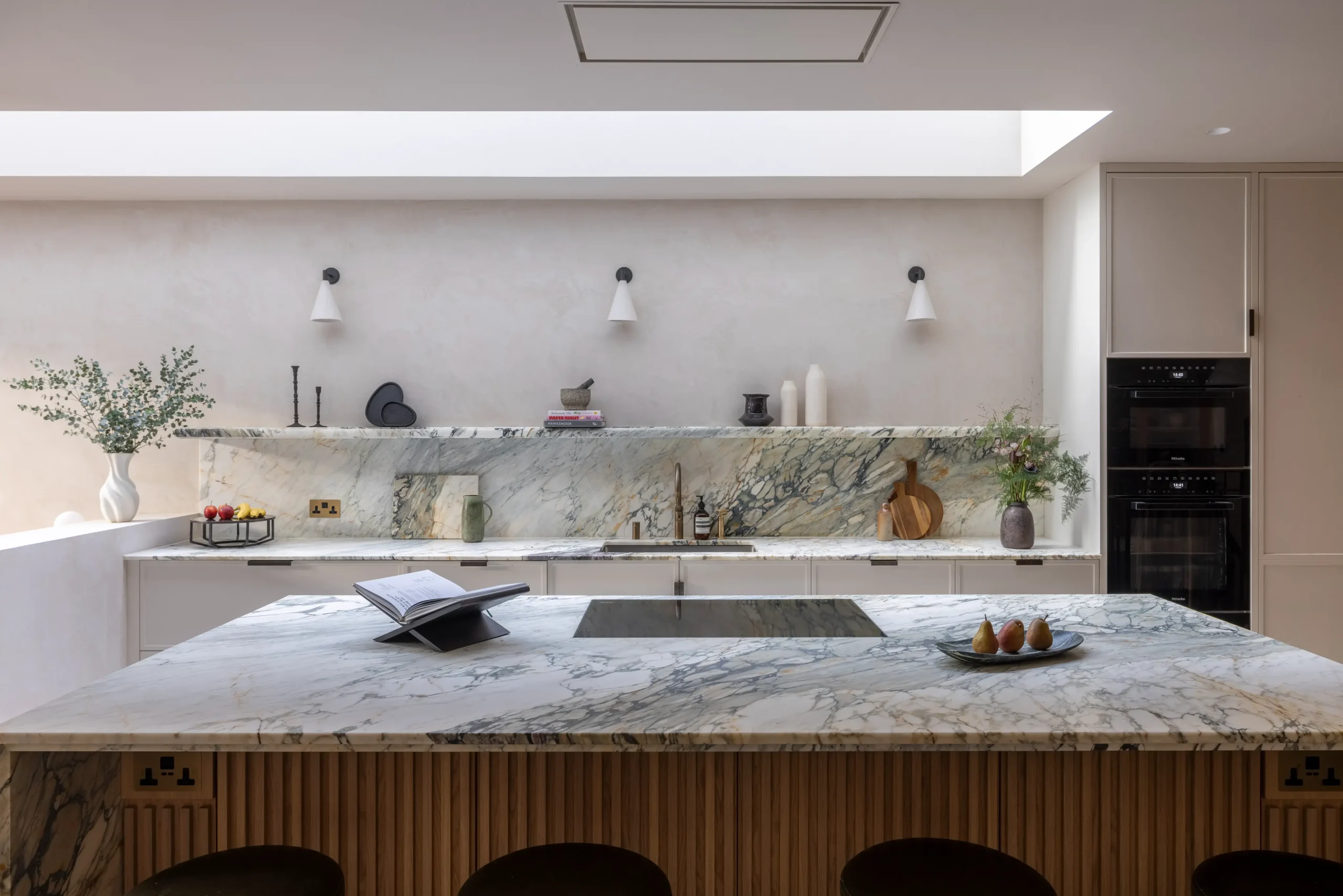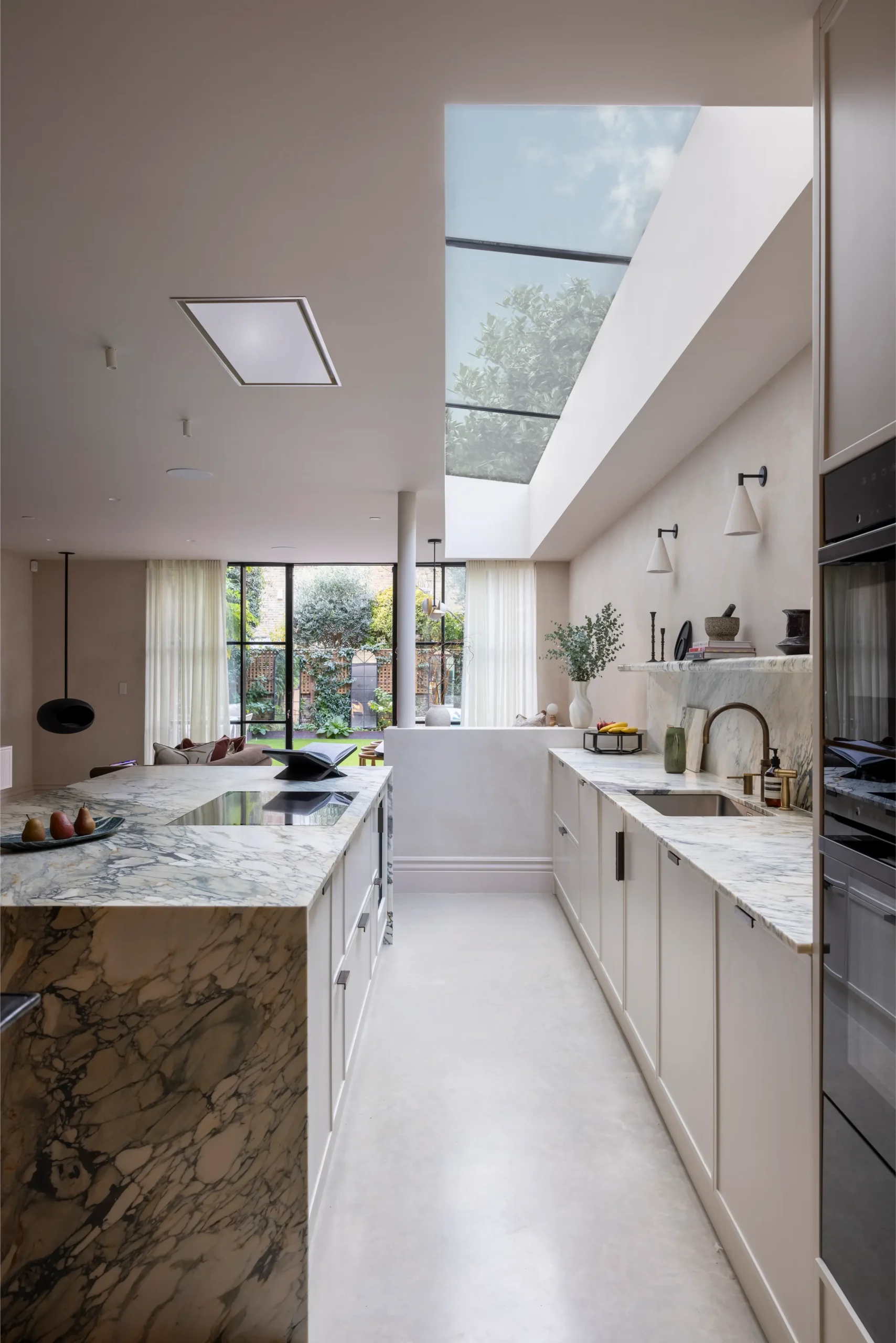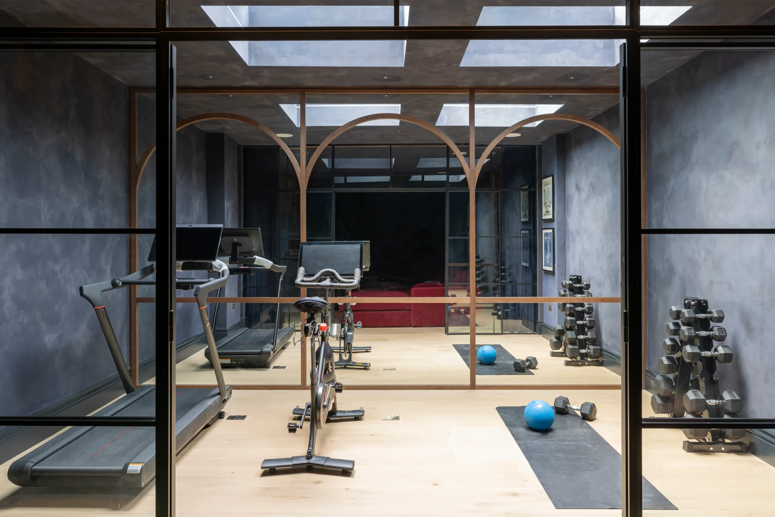 The addition of a striking basement extension enhances the home’s functionality, housing a gym, cinema room, playroom, utility space, and a private guest suite. This new level is seamlessly connected to the main living areas via a bold custom steel staircase.