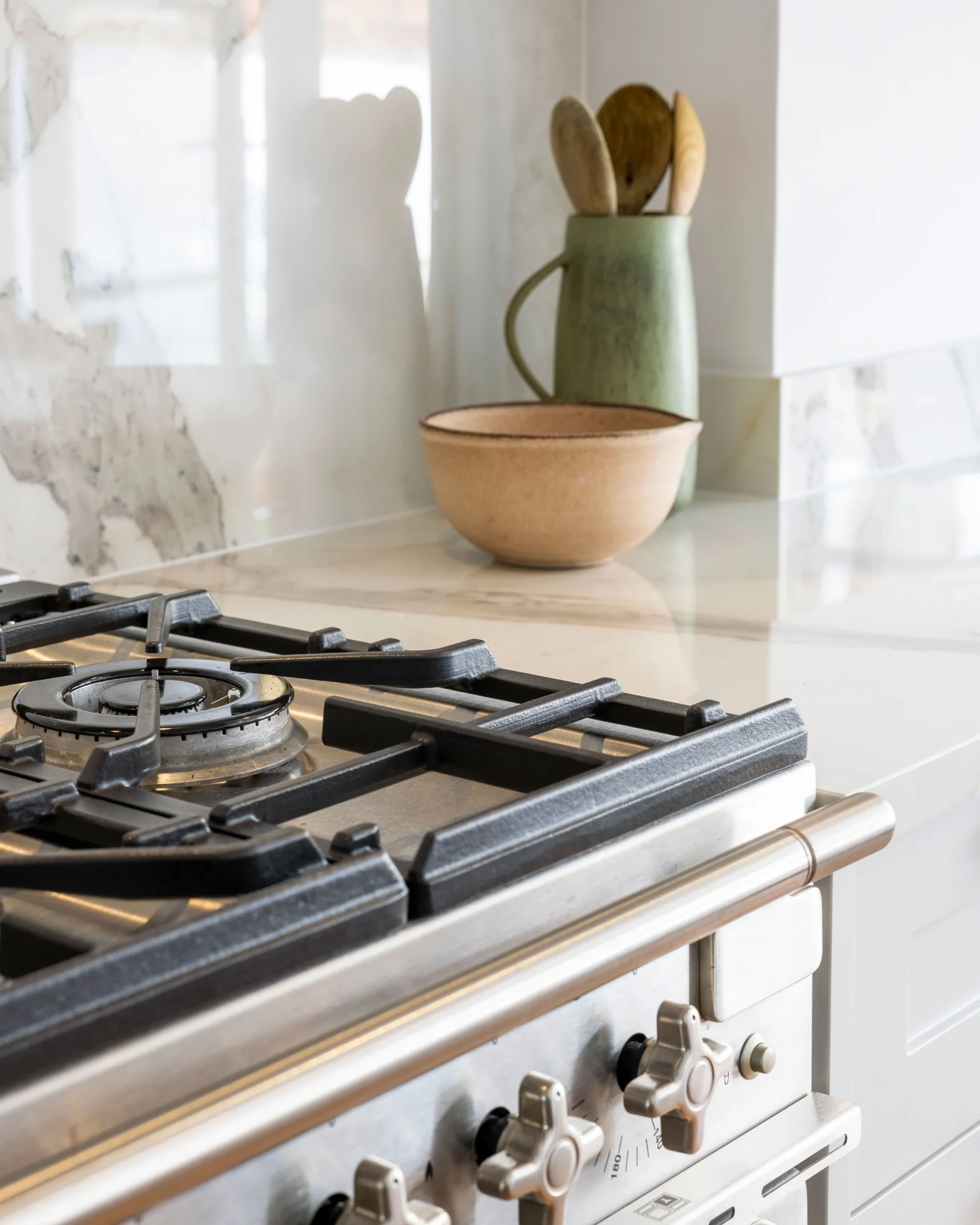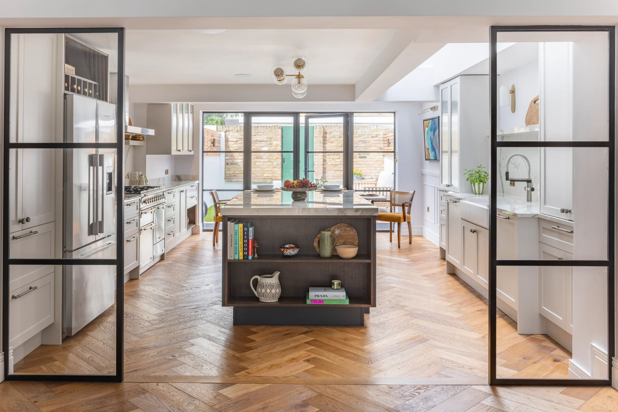 The newly designed open-plan kitchen and living space now extends from front to back, creating a seamless and airy environment. Heritage steel screens and bifold doors introduce light while maintaining a sense of architectural continuity.